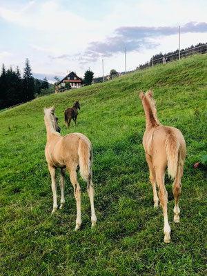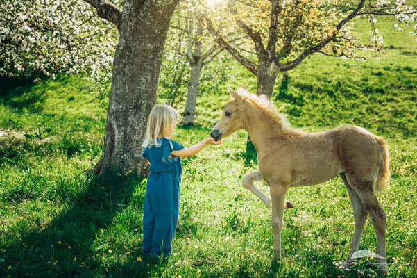 3 Wochen später brachte unsere Lady ihr 5. Fohlen "Sir Henry" ebenfalls von Cadlanvalley Sir Ivanhoe zur Welt. Im Gegensatz zu Bellissima ist das Palominohengstchen eher scheu. Seine Endgrösse wird um die 1.55 m sein.